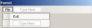 When closing a program, you usually have an X in the upper right hand corner of the screen, or a menu item that says Exit. Unless you change the ControlBox property on the form to False, the X will always be there. To add a menu to the form, we add a MenuStrip to the form then we can add which menus we want to add, and what appears in those menus. The naming convention for the menu strip varies a bit from other components, say we have a File menu and under it we have Exit. File would be named mnuFile and the exit under the file would be named mnuFileExit. In case you haven’t figured it out, the main menus would go horizontal and the submenus would go underneith the selected menu item, let’s add a File/Exit menu. When you’re done it should look like this: